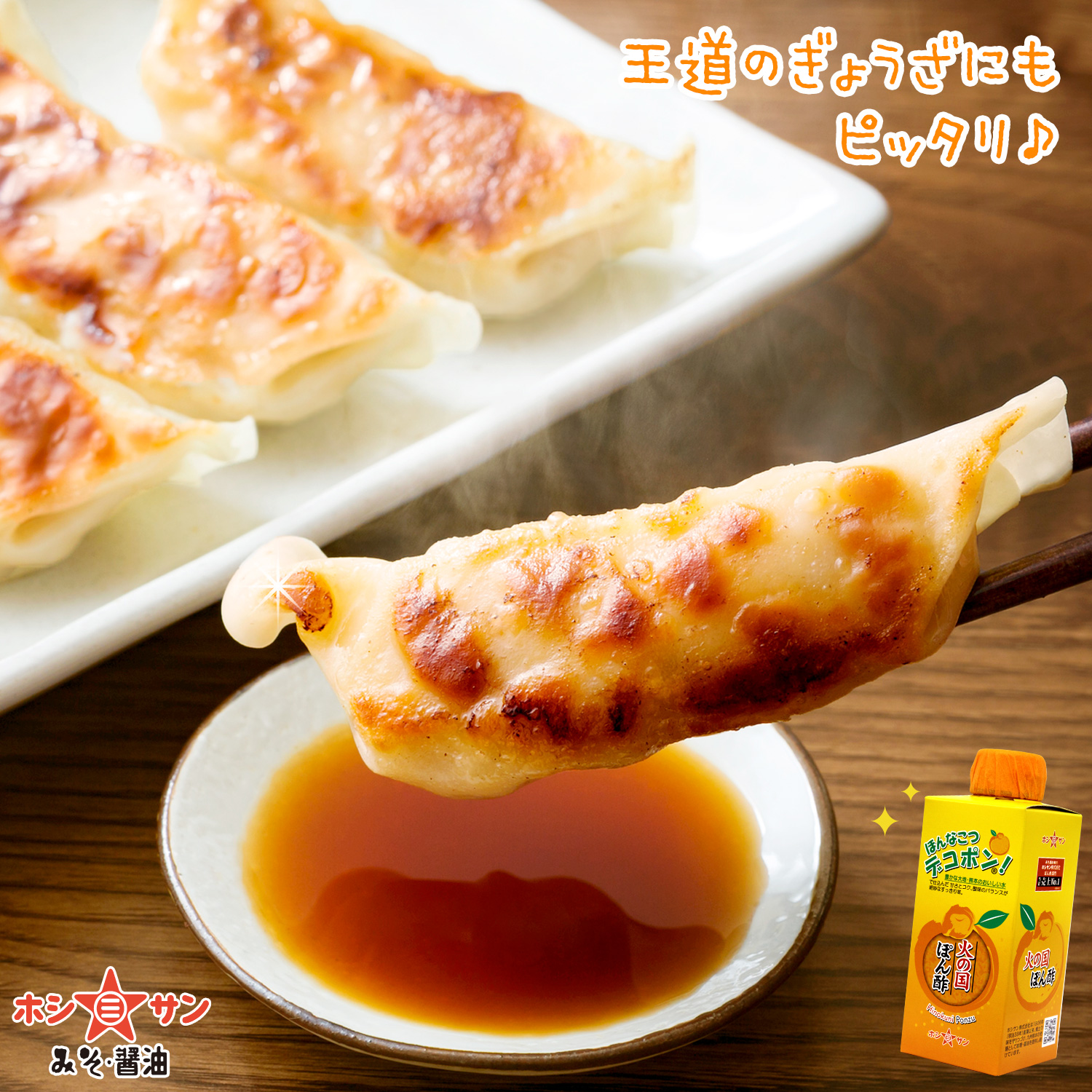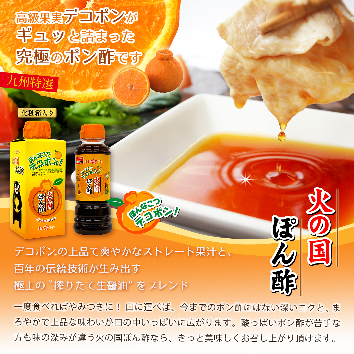 口に運べば、今までのポン酢にはない深いコクと、まろやかで上品な味わいが口の中いっぱいに広がります。くまもとの高級果実“デコポン®”の爽やかなストレート果汁と百年の伝統技術が生み出す極上の“搾りたて生醤油”をブレンドした究極のポン酢です。 酸っぱいポン酢が苦手な方も、味の深みが違う火の国ぽん酢なら、きっと美味しくおもし上がり頂けます。