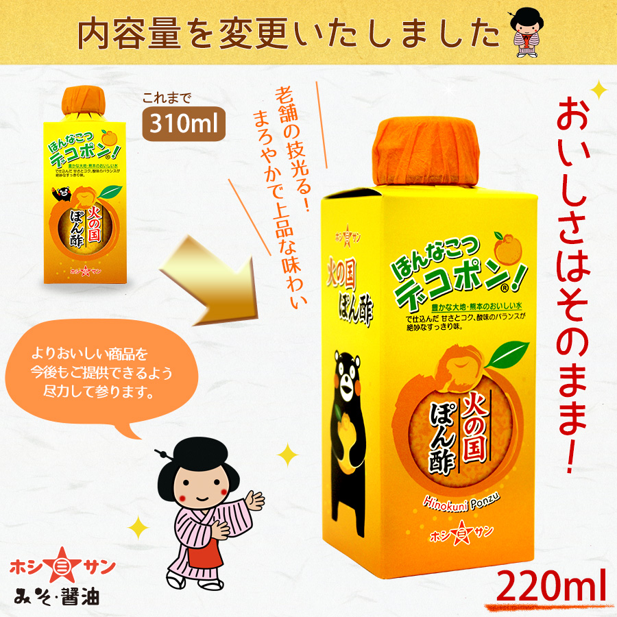 【くまもと特産】デコポン果汁たっぷり☆火の国ぽん酢220ml(化粧箱入り)【くまモンラベル】大人気ポン酢【九州熊本 老舗醤油屋ホシサン】