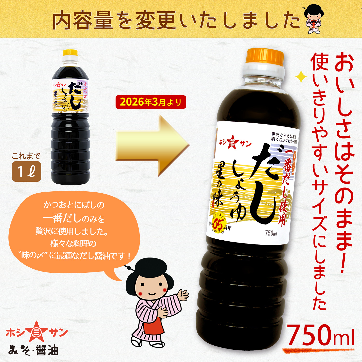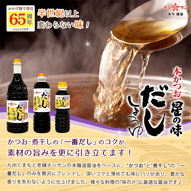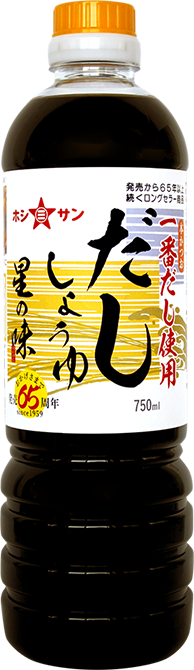 昭和34年10月に、「だししょうゆ《星の味》」として発売いたしました。九州・熊本の醤油をベースに、「かつお」と「にぼし(いりこ)」の「だし」を加えたしょうゆです。かつお節といりこを贅沢に使って煮出し、上品な味に仕上げました。