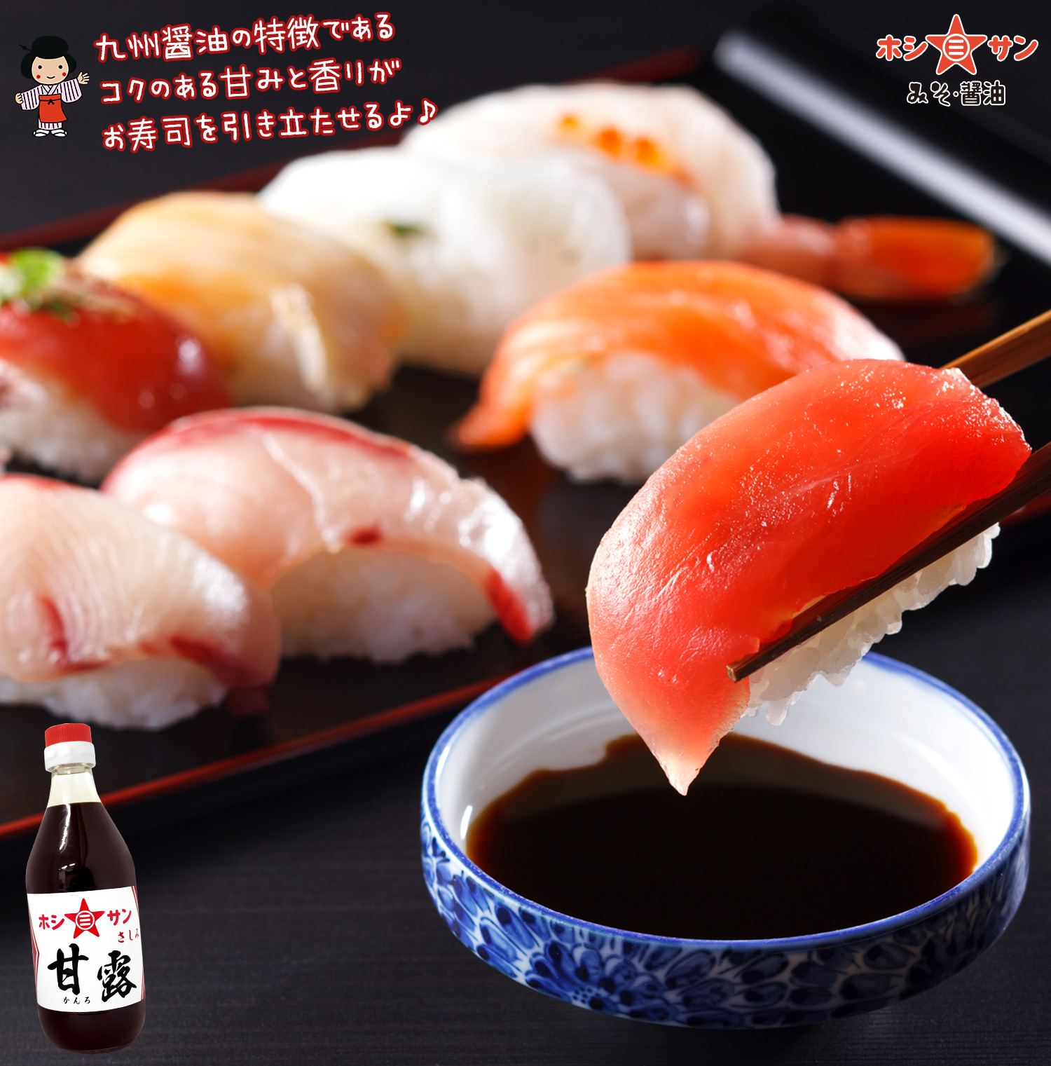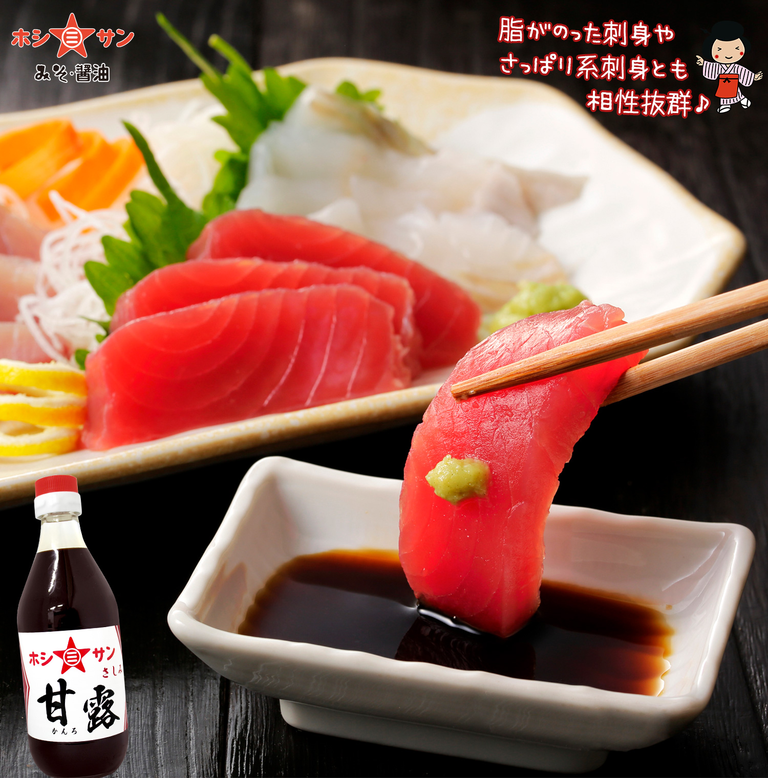 甘みの中のコクがさしみの味を引き立てる、九州・熊本のさしみ醤油をご賞味ください。
