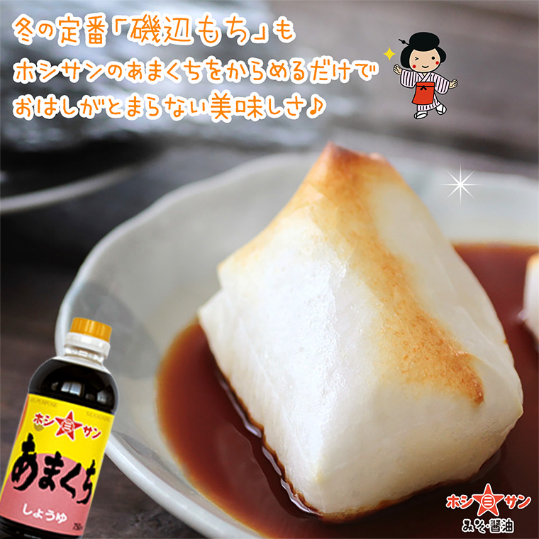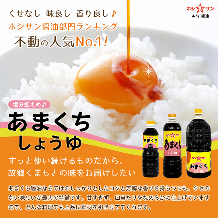 九州の甘口醤油の定番として、ホシサンの「あまくち」は、地元熊本だけではなく、全国のお客様にご愛顧頂いております。甘口醤油ならではのしっかりとしたコクと芳醇な香りを持ちつつも、くせのない味わいが最大の特徴です。甘すぎず、口当たりをなめらかに仕上げていますので、どんな料理でも上品に素材を引き立ててくれます。