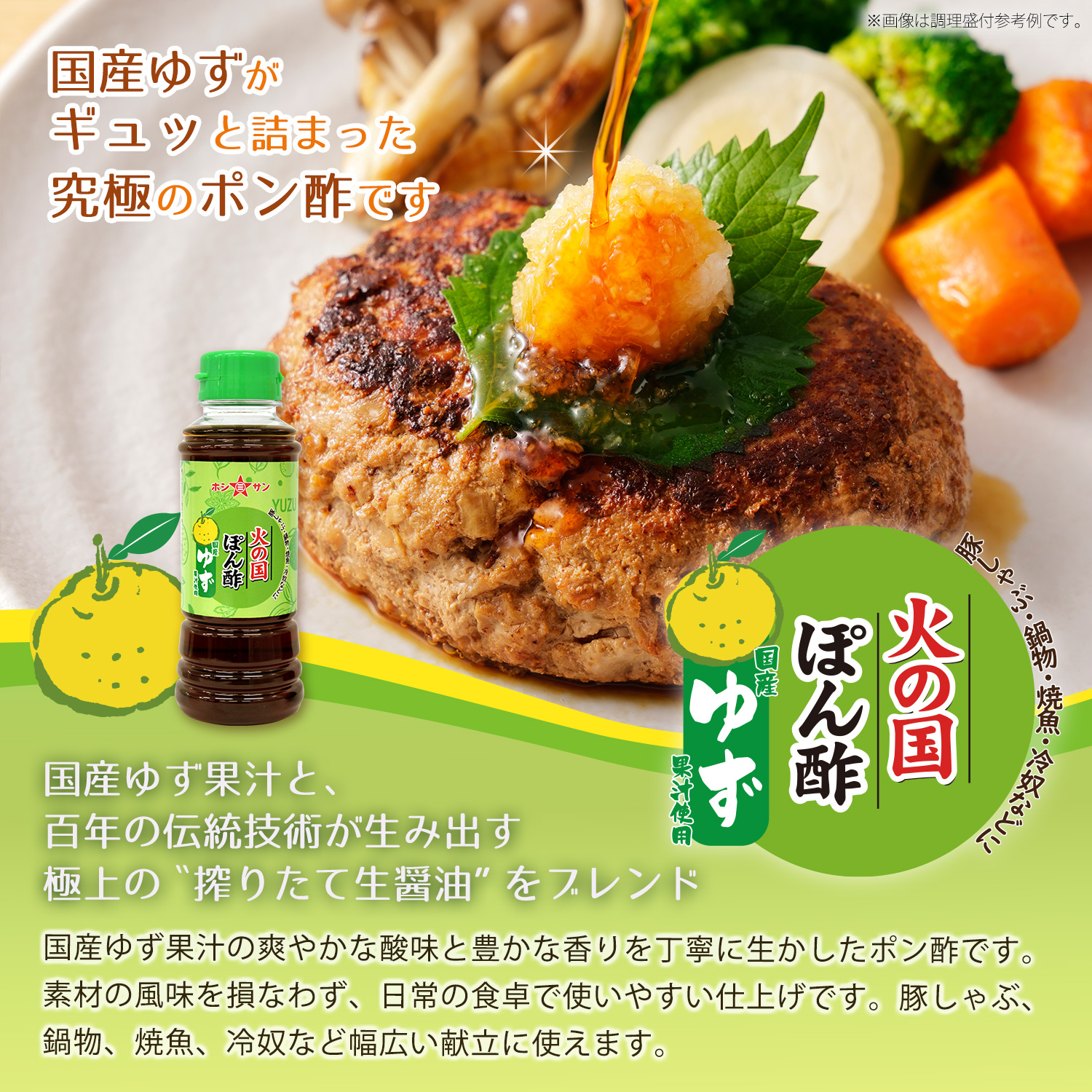 国産ゆず果汁の爽やかな酸味と豊かな香りを丁寧に生かしたポン酢です。