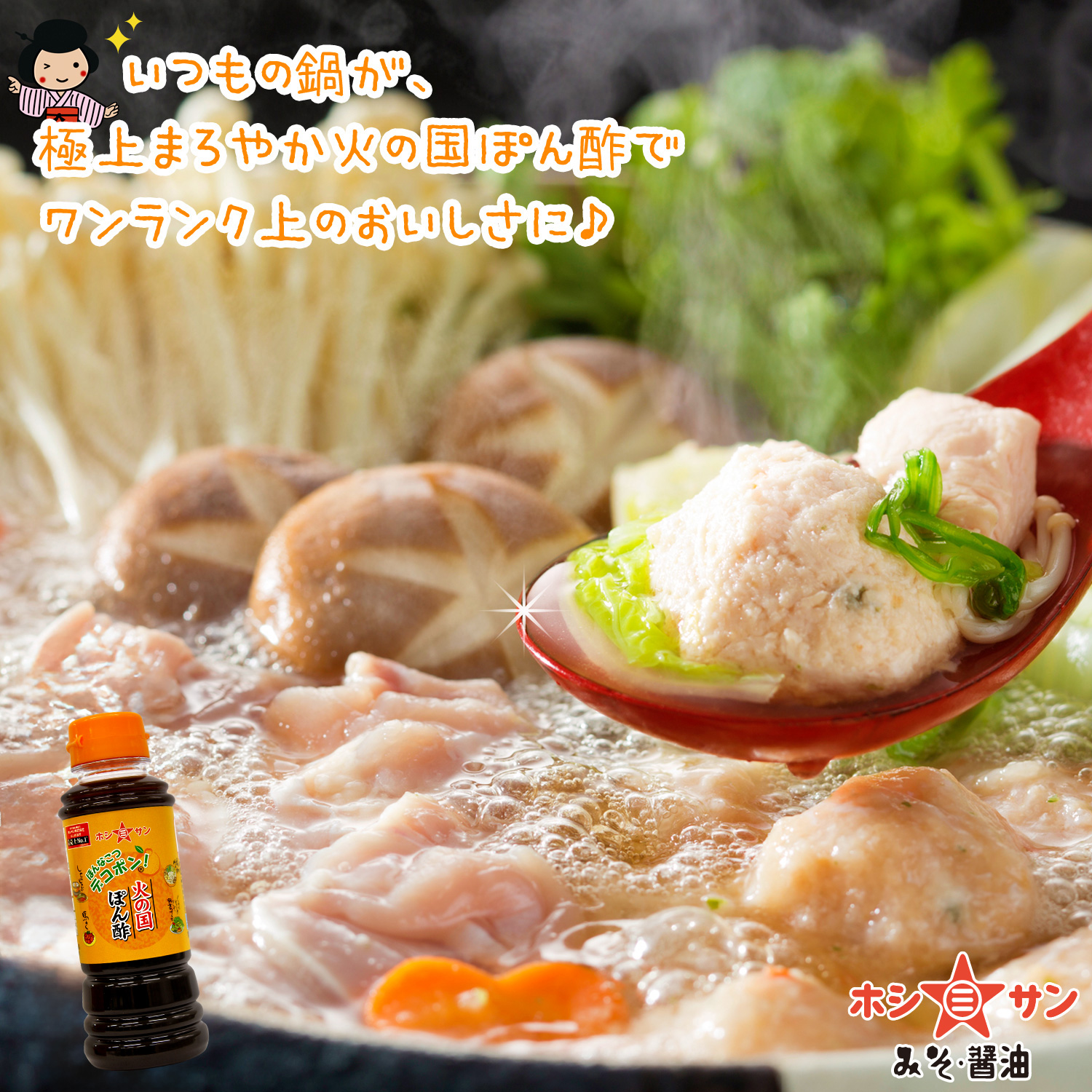 口に運べば、今までのポン酢にはない深いコクと、まろやかで上品な味わいが口の中いっぱいに広がります。くまもとの高級果実“デコポン®”の爽やかなストレート果汁と百年の伝統技術が生み出す極上の“搾りたて生醤油”をブレンドした究極のポン酢です。 酸っぱいポン酢が苦手な方も、味の深みが違う火の国ぽん酢なら、きっと美味しくおもし上がり頂けます。