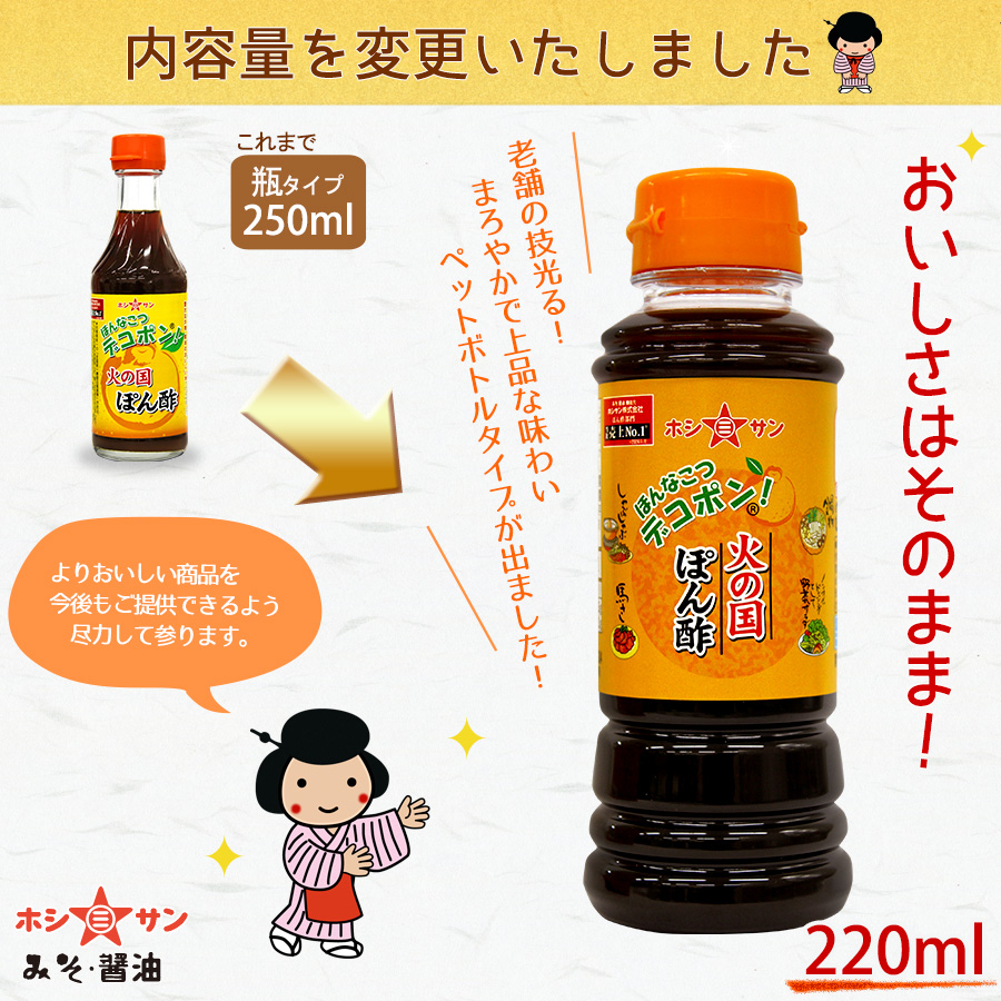 デコポン果汁たっぷり!火の国ぽん酢220ml(ペットボトルタイプ)酸っぱくない まろやかポン酢【九州熊本 老舗醤油屋ホシサン】