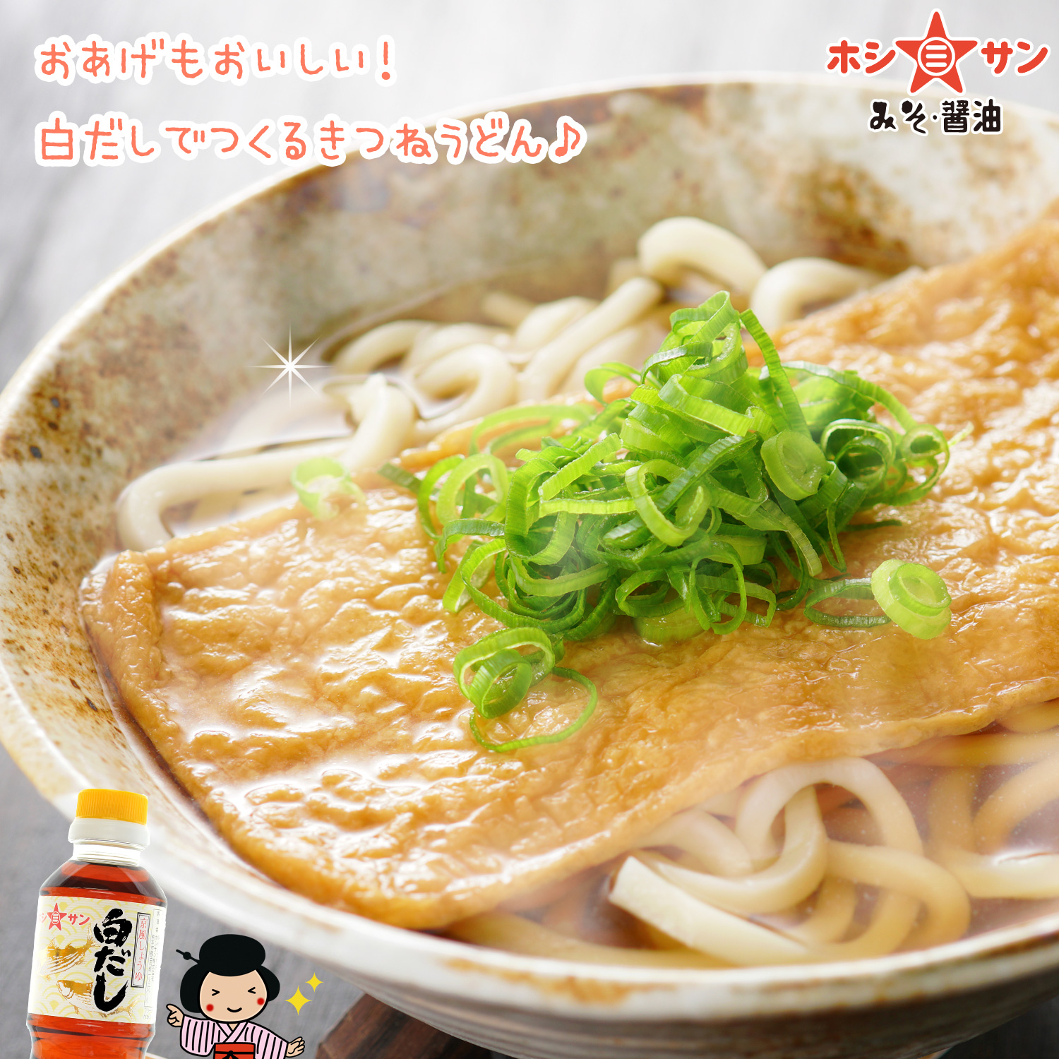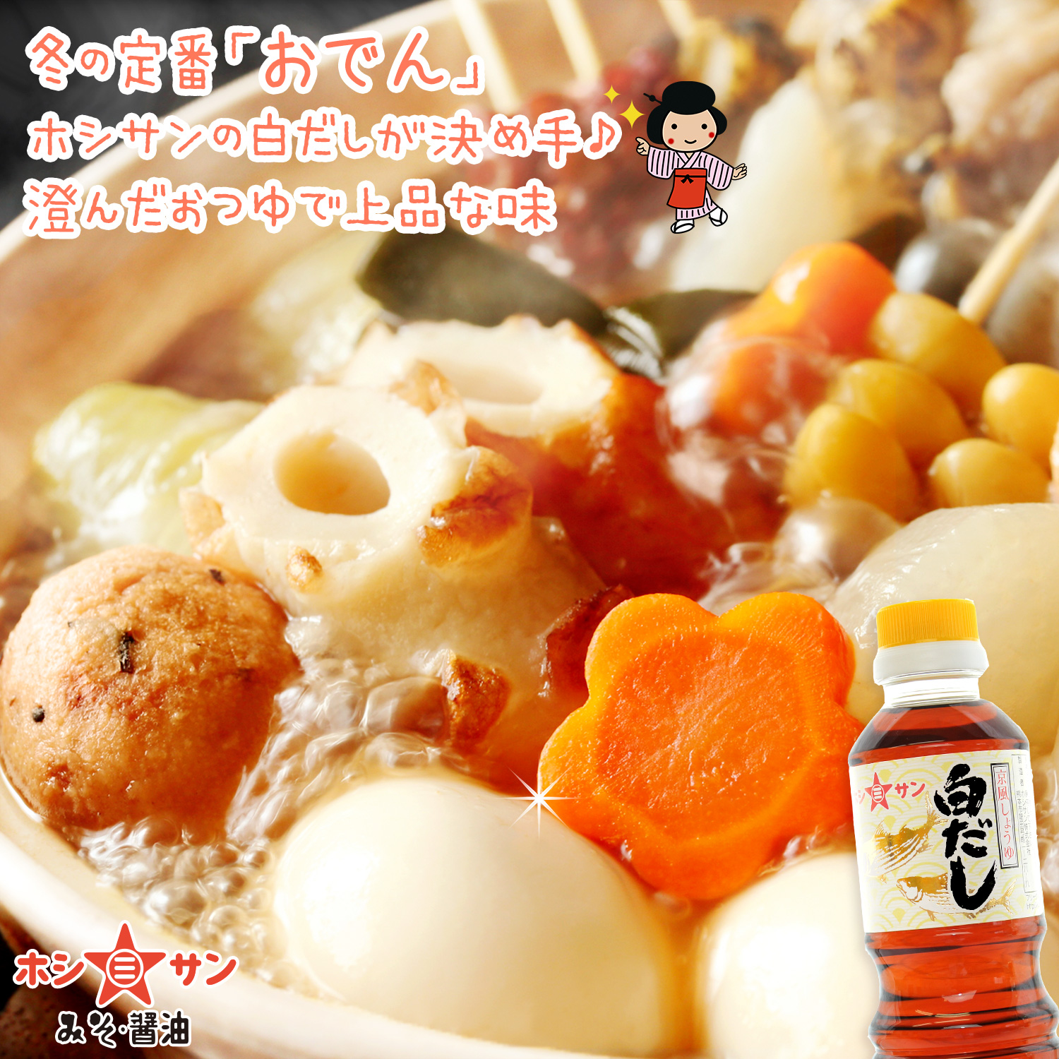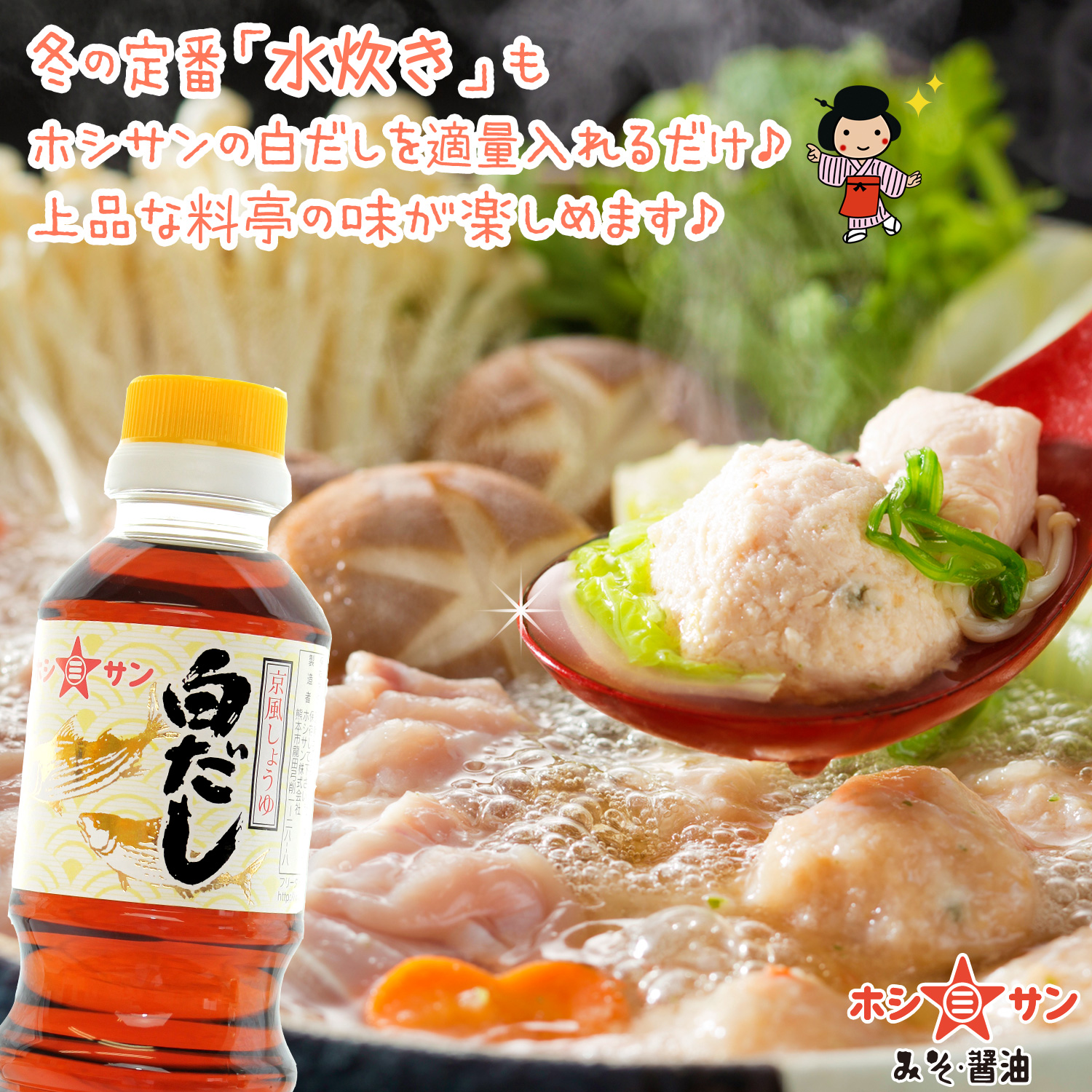 九州くまもと老舗ホシサンの上質なうすくち醤油をベースに、厳選した鰹・昆布・干し椎茸の旨みを贅沢にブレンドし、伸びのある味に仕上げています。卵焼き・お吸い物・うどんつゆ・鍋物・雑炊等、素材の色を活かす料理に最適です♪