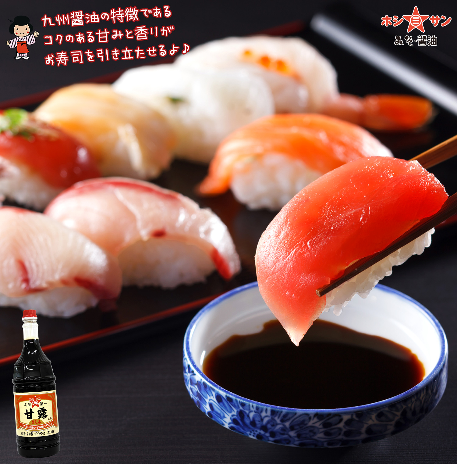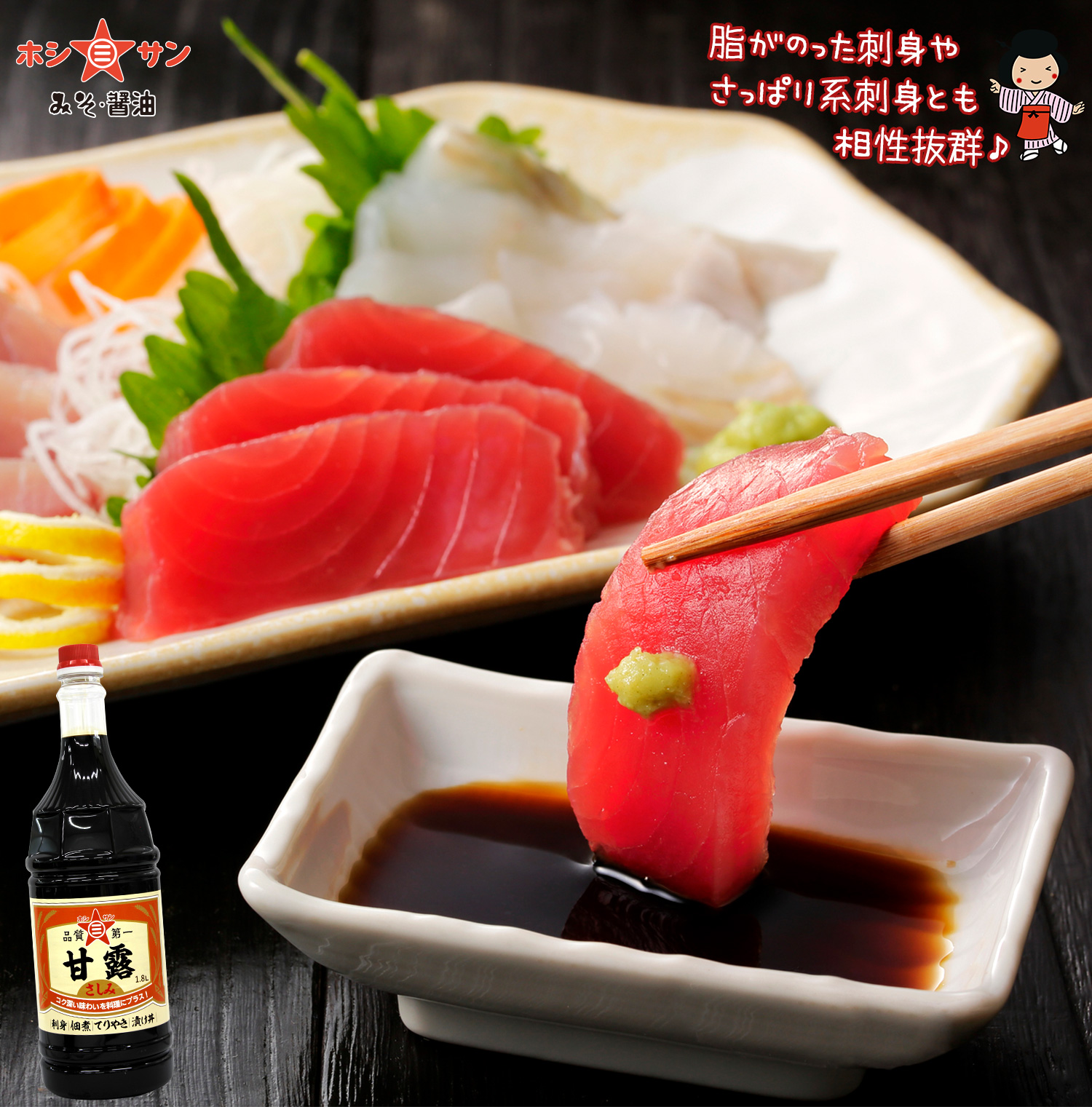 甘みの中のコクがさしみの味を引き立てる、九州・熊本のさしみ醤油をご賞味ください。